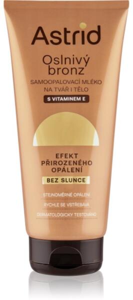 Astrid Sun, 200 ml, Önbarnító készítmények nőknek, A test barnítására szolgáló Astrid Sun önbarnító készítménnyel egész évben szép napbarnított bőre lehet. Tulajdonságok: bronzos árnyalatot kölcsönöz a bőrnek természetes napbarnított hatás hidratál és táplál gyorsan felszívódik egységesíti a lebarnulás színét és gyengéden tonizál könnyen alkalmazható arcra és testre is használható könnyen szétkenhető és kiválóan felszívódik Összetétel: E-vitamin – táplál, antioxidáns védelmet nyújt az idő előtti öregedés és a szabad gyökök okozta károsodások ellen, segít a ráncok kisimításában és a bőr feszességének és rugalmasságának helyreállításában Használata: Vigyen fel megfelelő mennyiségű készítményt a teljes testfelületre. Kenje szét alaposan és egyenletesen. Alkalmazása után alaposan mossa meg a kezét.
