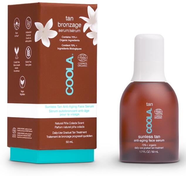 COOLA Napmentes Tan Anti-Aging arcszérumA Sunless Tan Anti-Aging Face Serum a COOLA-tól természetes, csíkmentes barnaságot kölcsönöz az arcbőrnek, mintha megcsókolta volna a nap! A 70%-ban bio minősített összetevőkből álló formula ötvözi az argánolajat, a C-vitamint, a hialuronsavat és a növényi őssejtkultúrákat. Az egyenletes, akár három napig tartó barnaság mellett a szérum hidratálja a bőrt és öregedésgátló hatással is rendelkezik.